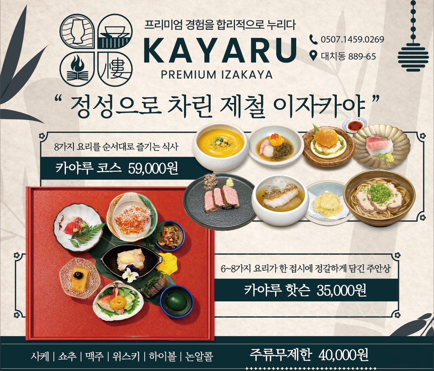 카야루는 다양한 종류의 술과 안주를 제공합니다.